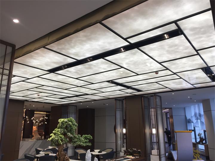 一層簽約區,不銹鋼紅古銅藝術玻璃夾絲隔斷 不銹鋼造型吊頂。